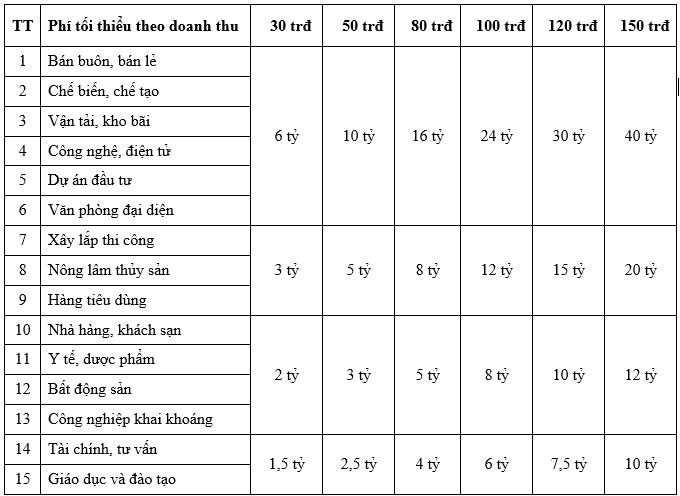 TT | Phí tối thiểu theo doanh thu | 30 trđ | 50 trđ | 80 trđ | 100 trđ | 120 trđ | 150trđ |