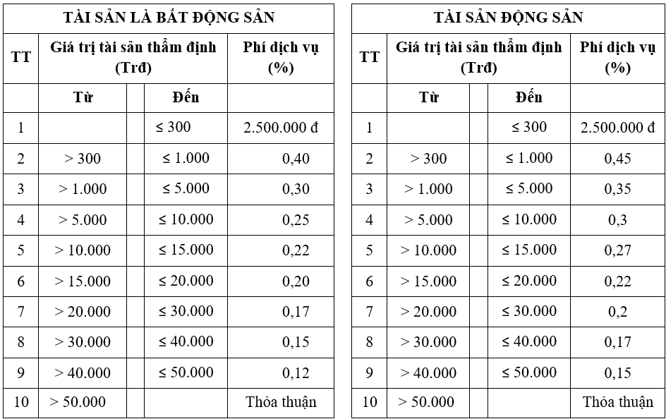 TT | Giá trị tài sản thẩm định (Trđ) | Phí dịch vụ (%) | |